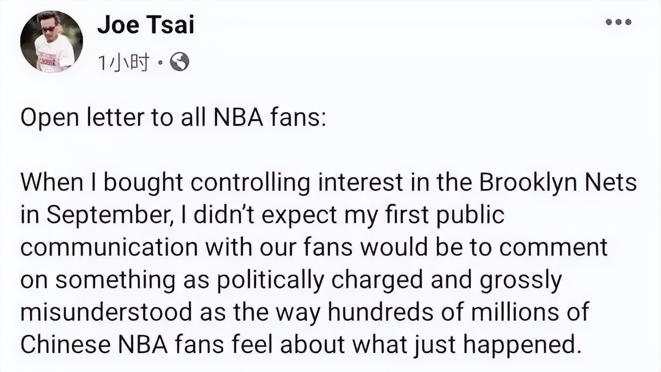 2019年,因為“莫雷事件”的持續發酵,蔡崇信還洋洋灑灑地寫了一封《致所有NBA球迷的公開信》。