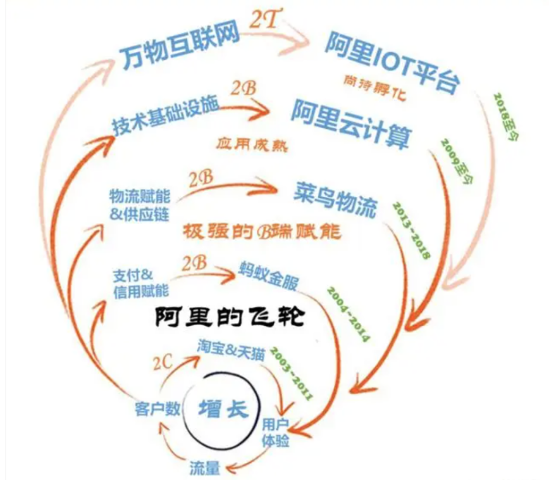 正是基於這種核心主業的產業鏈佈局協同發展的邏輯,阿里構建起了一個以中心驅動、層層遞進、強耦合協同的五層飛輪。