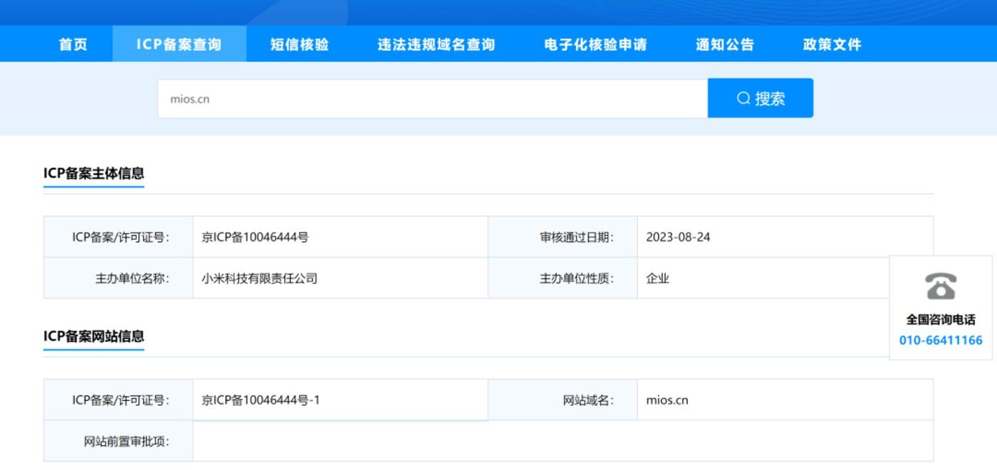 另外,工信部備案記錄顯示,小米科技有限責任公司在工信部備案 mios.cn 網站域名的記錄已在 8 月 24 日通過審核。