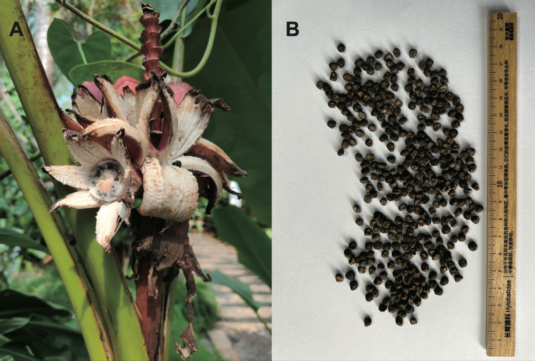 帶種子的野芭蕉。左圖是一種果皮顏色豔麗,成熟後自動炸裂開來的野芭蕉(Musa velutina);右圖是收集的該種的種子。圖片來源:中國科學院華南植物園