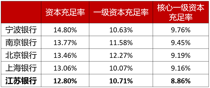 同行對比下,江蘇銀行的資本充足率明顯低於其他幾家大城商行,在17家城商行中也排名倒數。