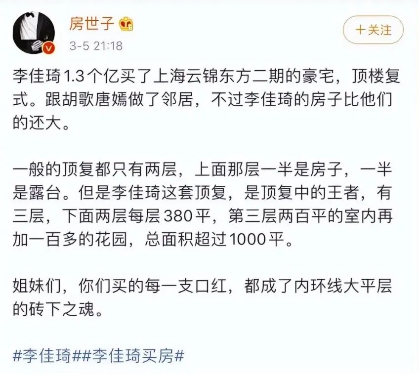 如今,李佳琦“露面”的次數少了,但他早已成為人生贏家。早在2020年,李佳琦就在上海花費1.3億買下了一處豪宅,而這不過是其收入中的九牛一毛。