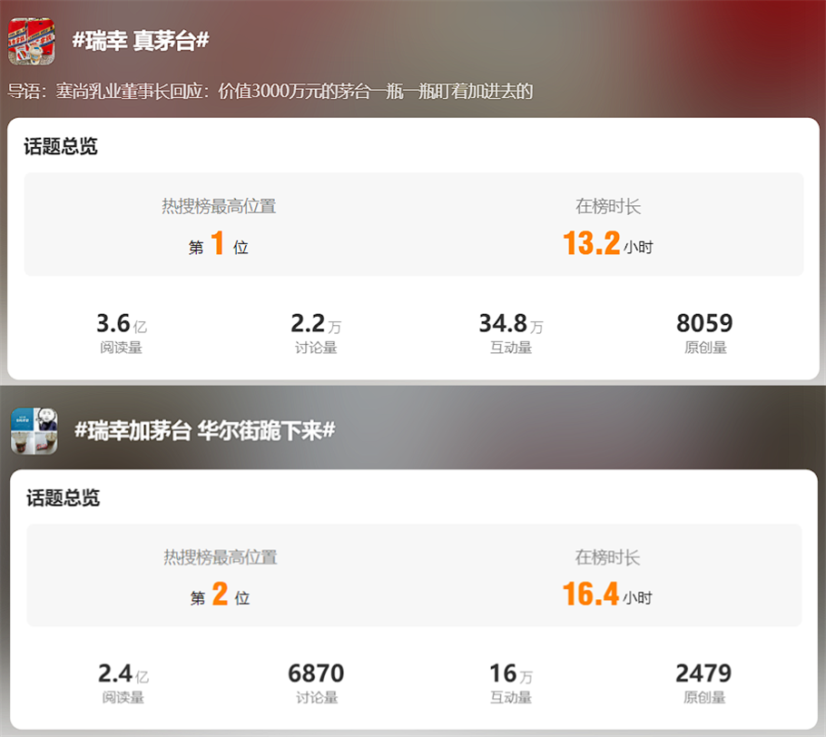 短短數日,瑞幸就已拿下#瑞幸 真茅台#、#瑞幸加茅台 華爾街跪下來#、#瑞幸醬香拿鐵#、#瑞幸公開原料生產記錄視頻#在內的,將近四十多條微博熱搜。其中,僅#瑞幸加茅台 華爾街跪下來#就在微博熱搜掛了16個小時,閲讀量輕鬆突破2.4億,吃瓜羣眾圍繞話題狂開商戰腦洞。