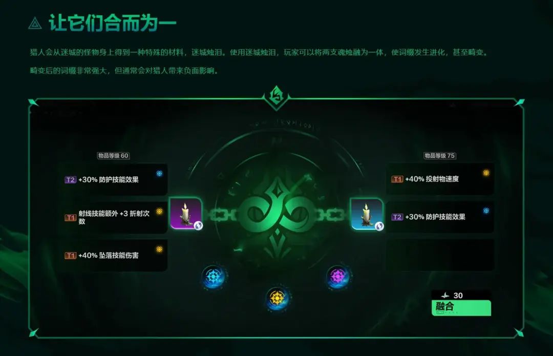 就像一般裝備一樣,“新裝備”魂燭通常擁有1至3條詞綴,玩家可以可以通過新賽季掉落的材料“迷城燭淚”將2支魂燭融合,強化這些詞綴的效果,甚至獲得極其珍貴的特殊詞綴。