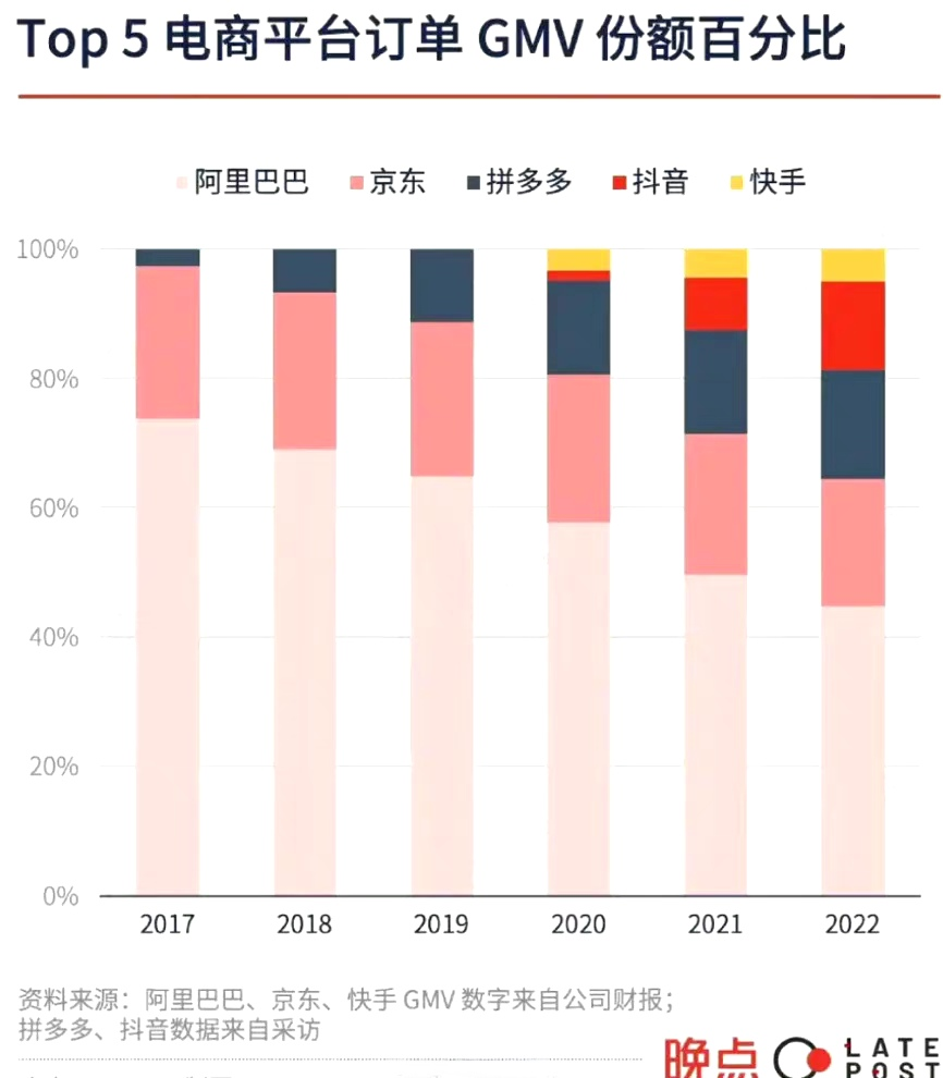 截至2022年,淘寶天貓有七成收入來自品牌商家。但隨着移動互聯網人口紅利見頂,電商平台增長趨緩,消費升級的成功,在某種程度上為佔領下沉市場帶來了阻礙,與此同時,拼抖快作為外部威脅已經一步步成長起來。**高盛一份報告曾指出,淘寶天貓的市場份額從2019年的66%下降到2022年的44%左右。**數據顯示,2022年,拼多多GMV超過3萬億元、抖音電商GMV超過1.6萬億元,兩家公司的GMV已經相當於半個多阿里。