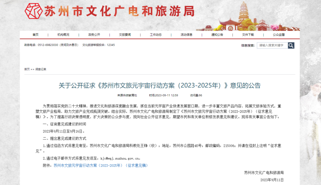 近日,蘇州市文化廣電和旅遊局制定**《蘇州市文旅元宇宙行動方案(2023-2025年)(徵求意見稿)》**,並向社會公開徵求意見。