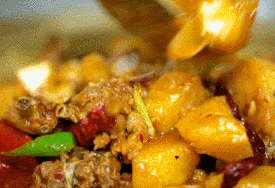 新疆大盤雞色澤鮮豔、雞肉嫩滑麻辣、土豆軟糯甜潤,辣中有香、粗中帶細,加上充分吸收了大盤雞汁水的筋道皮帶面,是餐桌上的佳品,百吃不厭。