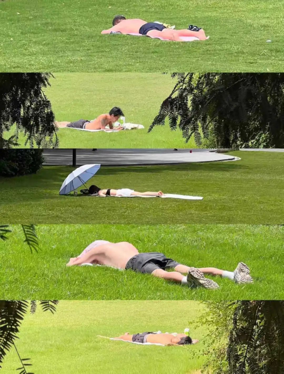 今年夏天公園草地上一排光膀子也是他們推崇的養生方式,所謂“三伏天曬背”就是人類進化出的光合作用,祛濕補氣,趴那就能冥想。
