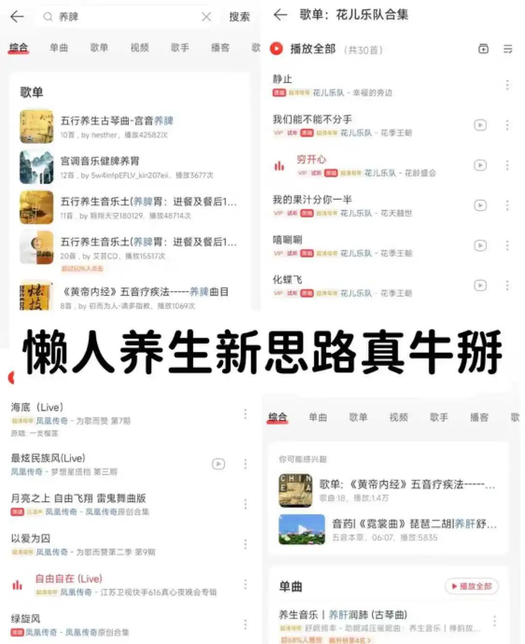 00後給拓展拓展,想要護肝養胃就搜“五音療愈”,純樂器太乾聽不慣,現代歌曲也能音樂療愈,比如增強磁場聽紅歌,振奮自己搜鳳凰傳奇,讓自己開心聽花兒樂隊,想治哪裏治哪裏。