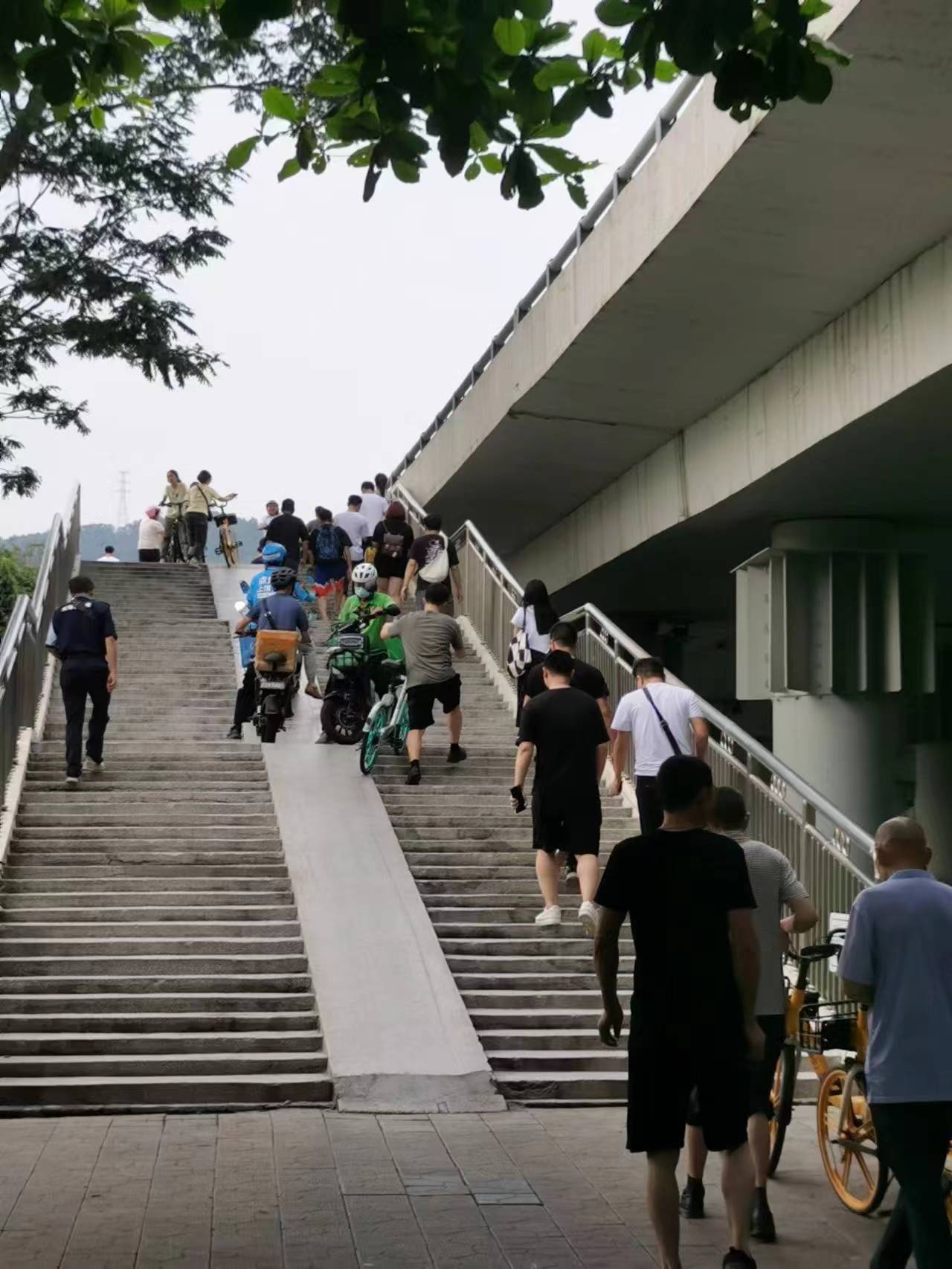 第一件:北環彩田立交,是我每天必經之道,隨着城市快遞業的繁榮發展,立交人行通知中間的通道太過狹窄,已經不堪重負,經常造成行人堵塞,上行的等下來的;下來的得等上面的通過才能上去….另外,中間這條過道除 窄之外,還格外光滑,是用的水磨石材料,雨天市民推單車上下行很容易滑倒。尤其是共享單越來越多,好多市民為圖省事,不想推着下去,直接騎車滑行溜下去,摔跤是常有的事。