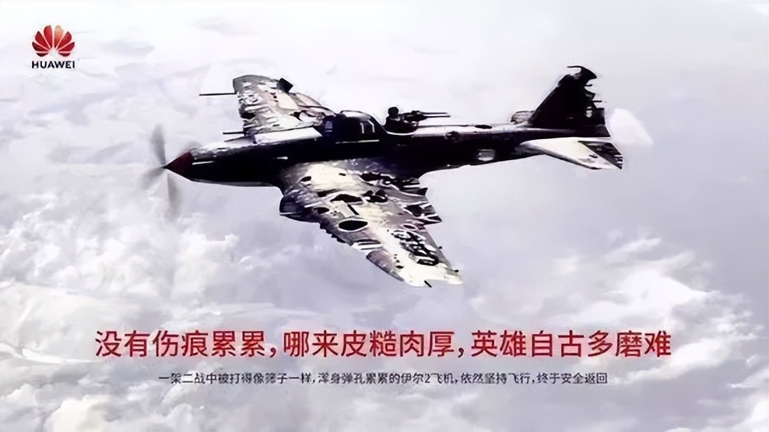 這又讓我想起華為的另一幅宣傳畫,一架二戰中滿是彈孔的伊爾-2飛機,在戰鬥中被打得像篩子一樣,但依然堅持飛行,最終安全飛回。