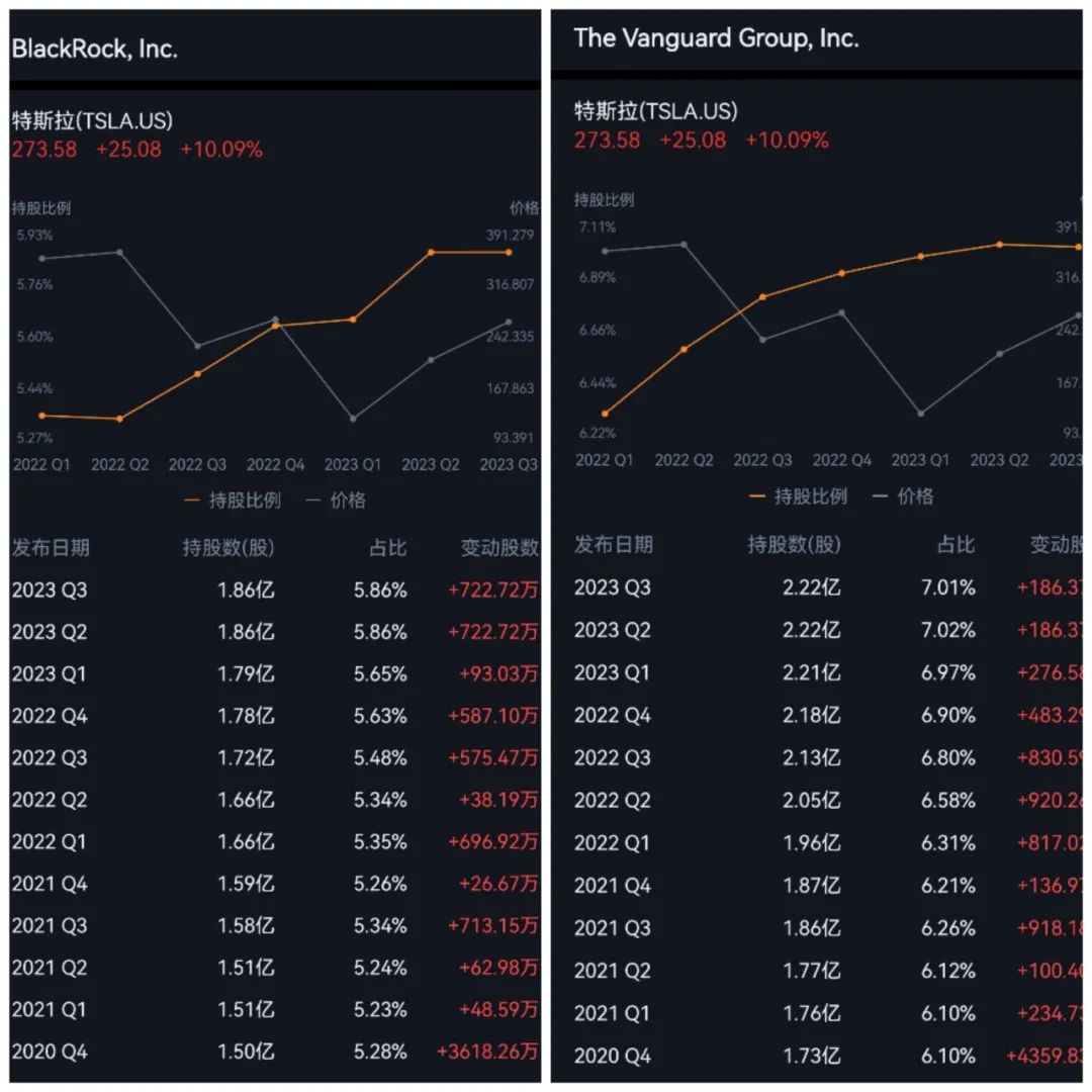 所以與蘋果公司2016年醜聞不斷股價下跌時,華爾街先鋒領航、貝萊德、巴菲特伯克希爾瘋狂買入蘋果籌碼如出一轍:特斯拉自2022年以來一直醜聞不斷,同時先鋒領航和貝萊德則不斷巨資加倉。