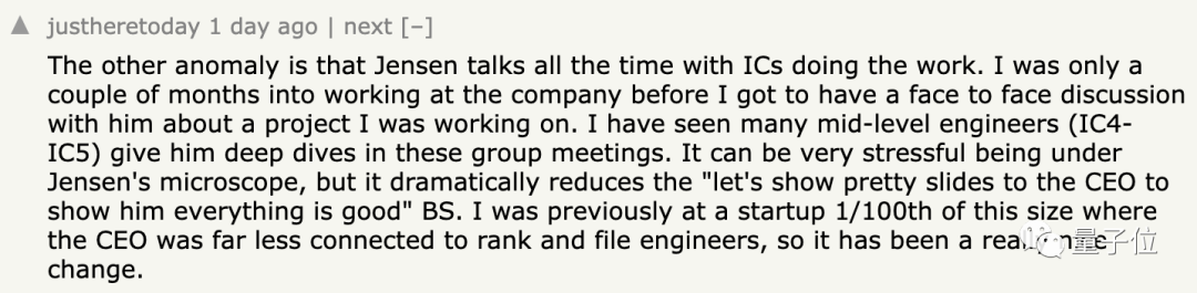 我之前在在一家只有規模只有英偉達1/100的初創公司幹過,相比起來,CEO與普通工程師之間的聯繫要少得多的多。