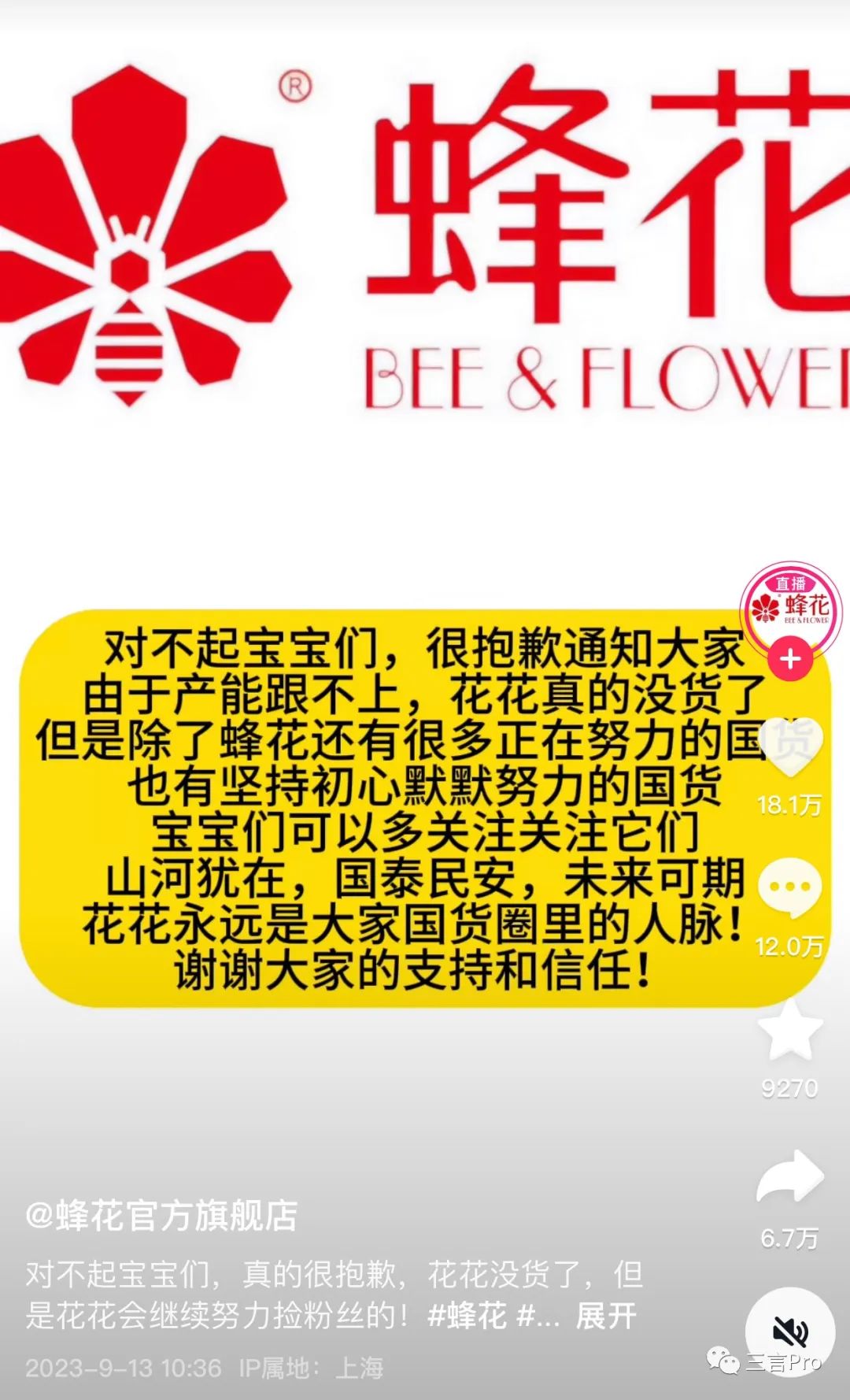 9月13日,蜂花發視頻宣佈僅12日一天就漲了五十萬粉絲。同時,蜂花也呼籲大家多多關注其他國貨品牌。