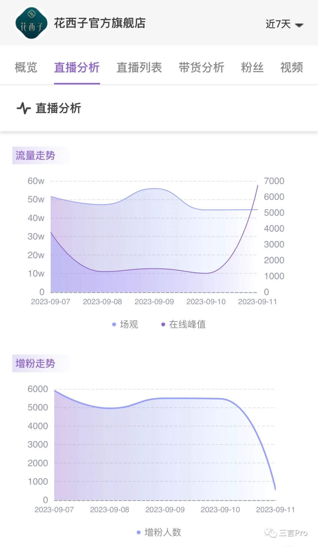 上海藥皂官方旗艦店於9月11日起,流量和增粉都暴漲,9月13日,場觀9.3萬,增粉2100餘人。