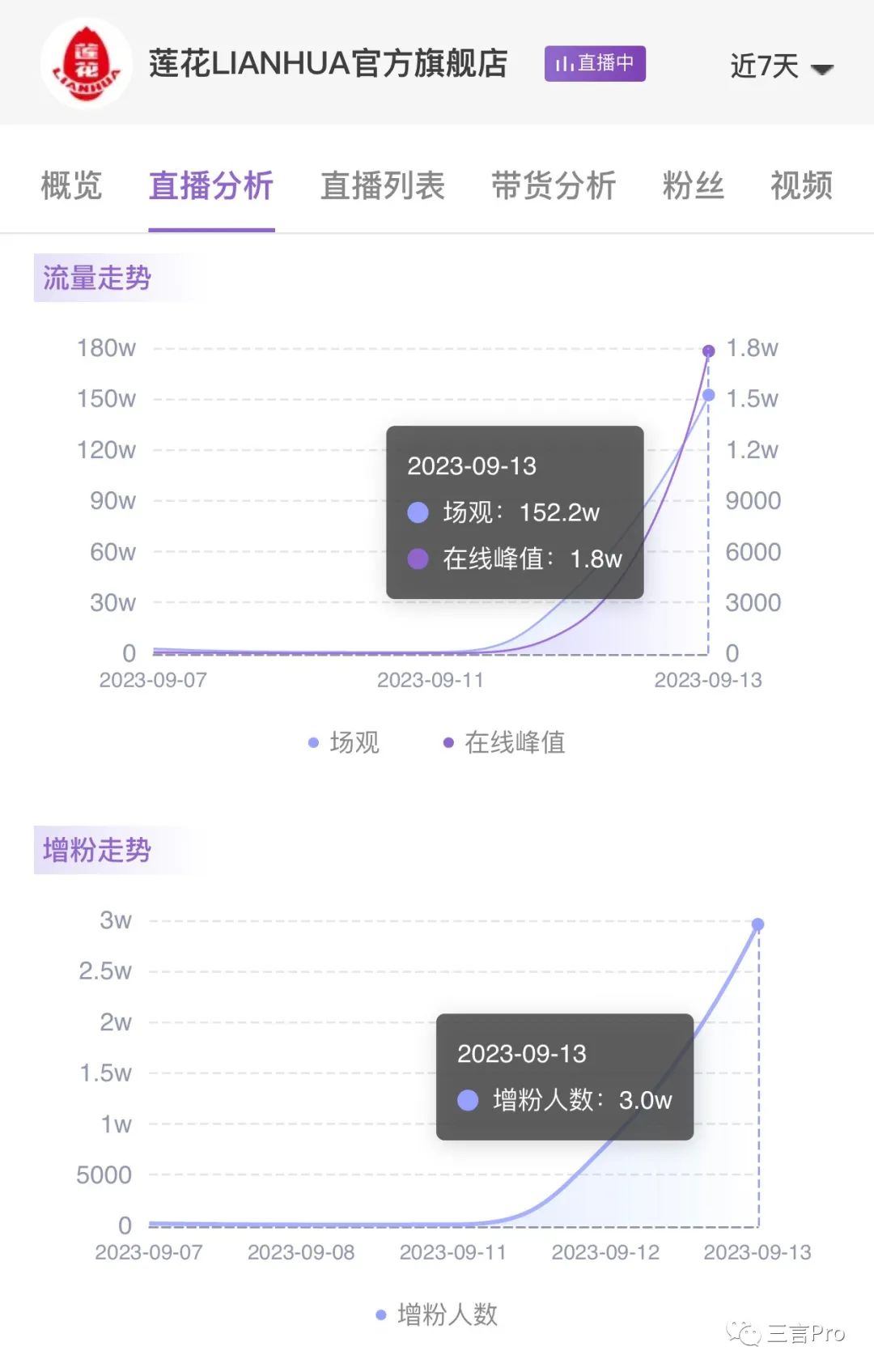 自9月11日起,蓮花味精官方旗艦店直播間也迎來流量和粉絲“雙豐收”,9月13日,直播間場觀達到152萬,增粉3萬。