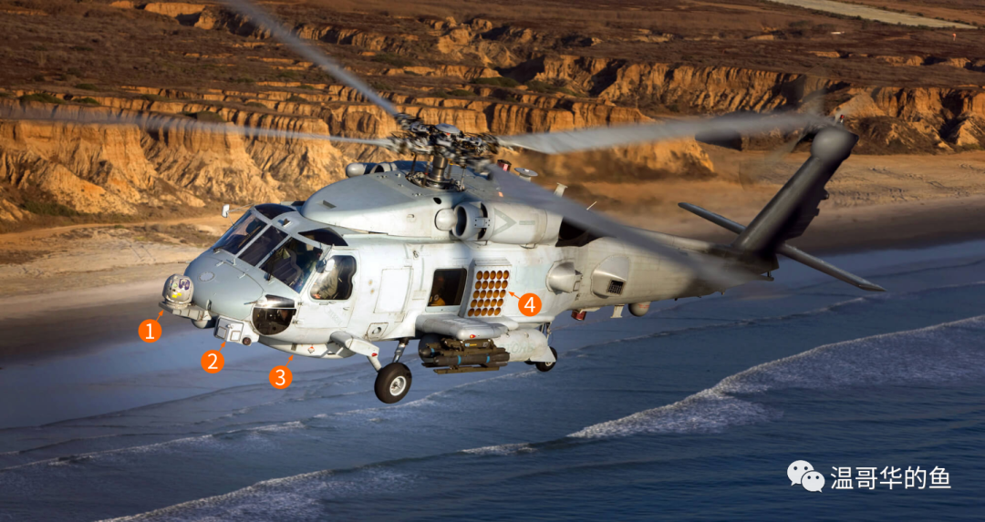 機鼻平台上的MTS-FLIR外觀和HH-60H/SH-60B的AAS-44(V)轉塔相似,顯得更方正一些。它們同為雷錫昂公司的產品,但MTS-FLIR的技術水平要高得多,光學窗口也要多一倍。該系列產品廣泛應用在C-130、MQ-9C“死神”、MQ-1“捕食者”、MH-60“鋪路鷹”等飛機上,產量超過3千部。實際上除了磁探儀,MH-60R整合了前三型海鷹的全部重要設備,也具備所有作戰能力,而且可以同時執行多重任務。