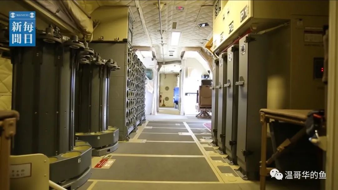 在SRL發射器後方還有左2右1共3具備用的單管聲納浮標發射器,左側廁所前面的地板上還有一個應急重力投放口,所以從底下看共有7個投放口。全機最多共可攜帶129枚各類聲納浮標,超過P-3C的84枚和P-1的100枚。