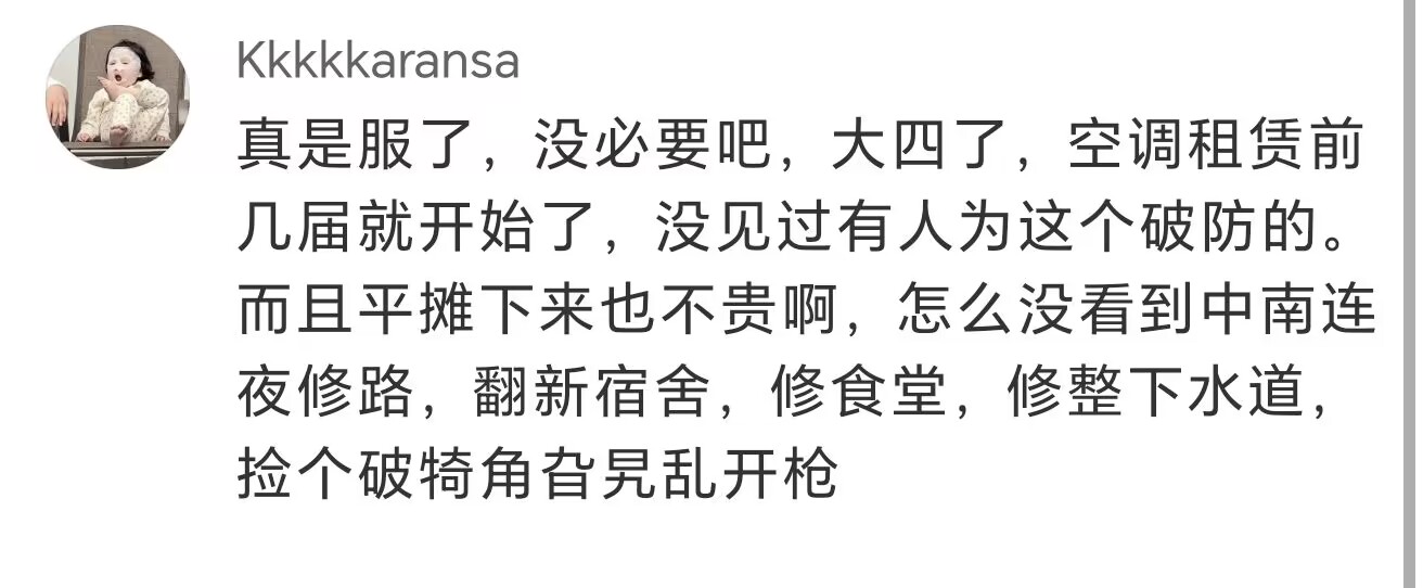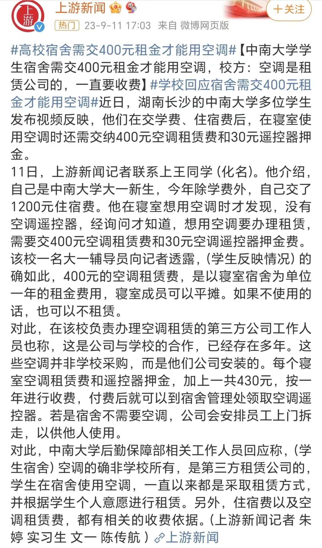 中南大學學生宿舍需交四百元租金才能用空調,校方稱空調是租賃公司的,你怎麼看?_風聞