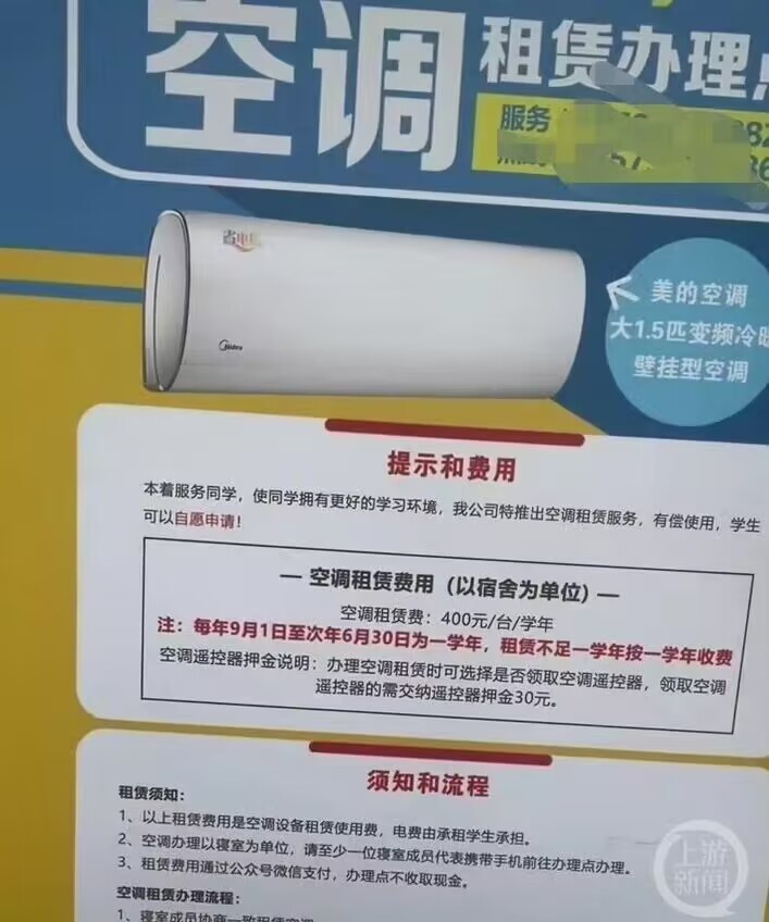 而在該校負責辦理空調租賃的第三方公司工作人員也表示,這是公司與學校的合作,已經存在多年。這些空調並非學校採購,而是他們公司安裝的。每個寢室空調租賃費和遙控器押金,加上一共430元,按一年進行收費,付費後就可以到宿舍管理處領取空調遙控器。若是宿舍不需要空調,公司會安排員工上門拆走,以供他人使用。