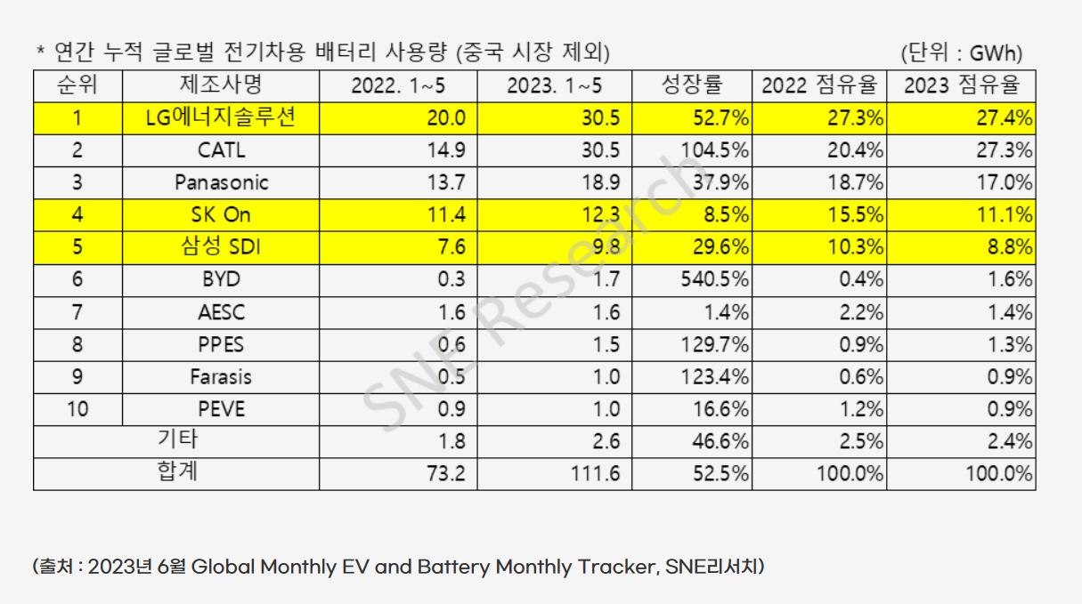 根據SNE Research數據,2023年1-5月寧德時代海外(除中國)動力市場份額為27.3%,比去年同期提升6.9個百分點,其中5月份海外(除中國)份額為28.9%,連續兩月排名第一。寧德時代1-5月歐洲市場份額為34.5%,同比大幅提升9.3個百分點,其中5月份歐洲市場份額為36.8%,也已連續兩月排名第一。