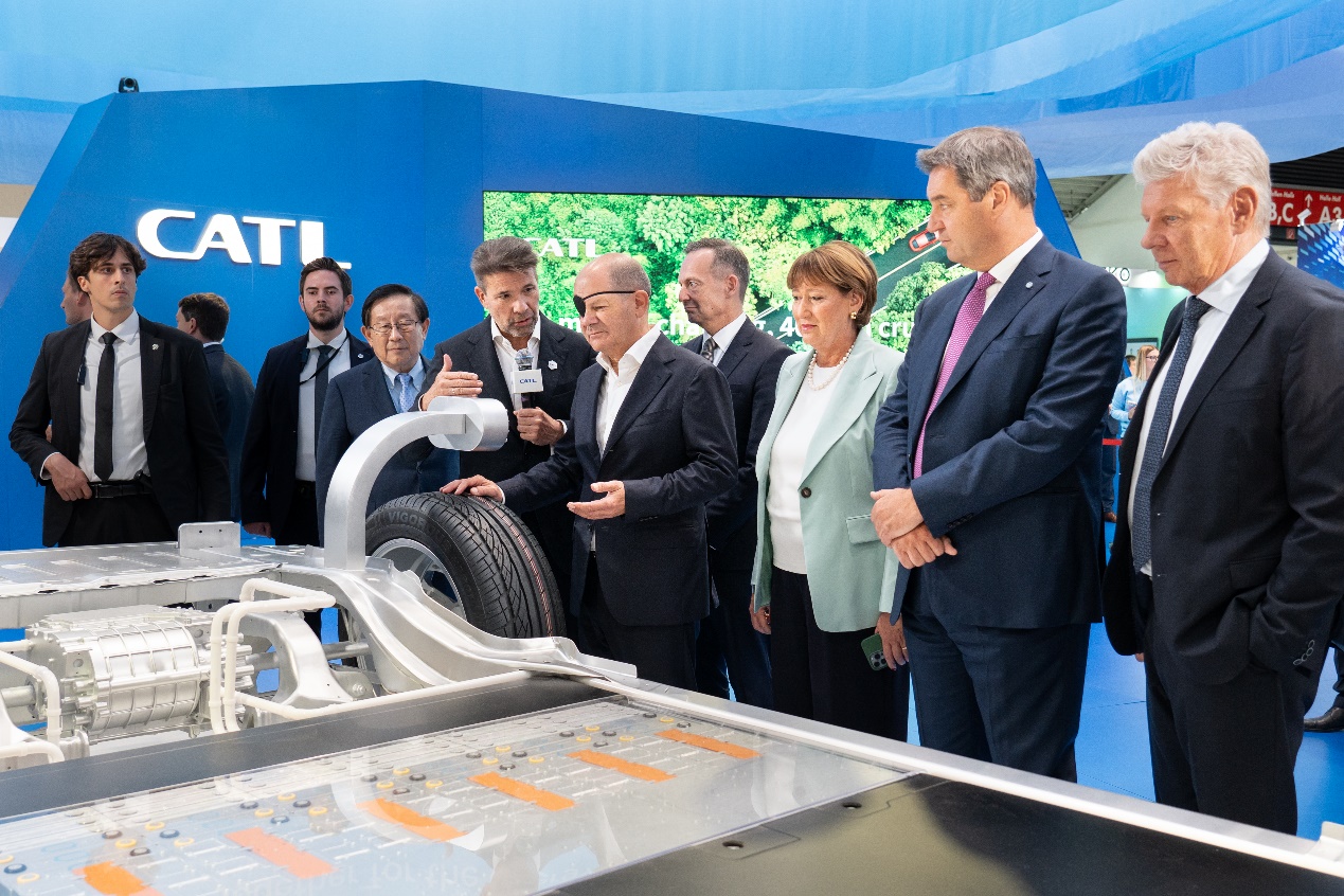 德國總理朔爾茨(Olaf Scholz)與德國汽車工業協會主席穆勒以及拜仁州州長索德爾一行,還特意參觀訪問了寧德時代在IAA的展台。值得一提的是,寧德時代是舒爾茨本次參訪時唯一拜訪的中國企業。