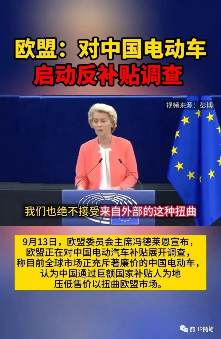 歐盟對中國電動汽車發起反補貼調查,無法阻攔中國汽車產業發展,只不過是對市場經濟説一套做一套的雙標婊行為再一次露出來而已。中國電動車太牛,所以早就估計歐洲會對電動車進行反傾銷或者反補貼之類的行為;我在談中國電動車話題早就説過幾次,不幸言中,但是沒想到歐洲這麼不要臉、這麼快就動手了,以為至少要明年呢。