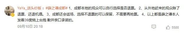 接着,薛之謙現場宣佈:成都本地樂迷隨時可以退票。