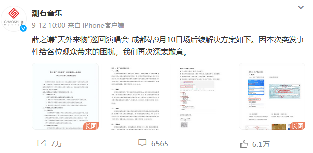 兩天後的12日上午10:00,薛之謙所屬公司潮石音樂官微公佈了退票細則。