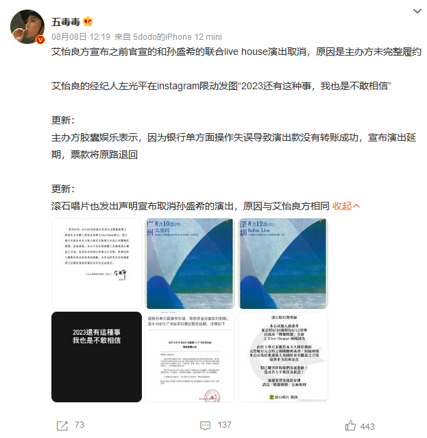 無獨有偶,該主辦方8月份負責的艾怡良、孫盛希聯合專場,一樣在演出前幾天突然宣佈取消。