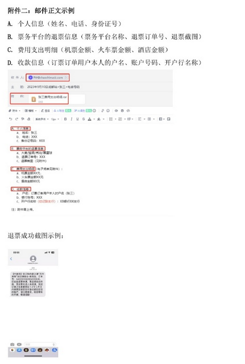 附件二,申請退票的郵件格式,具體到標題、正文、附件、退票成功的短信截圖。