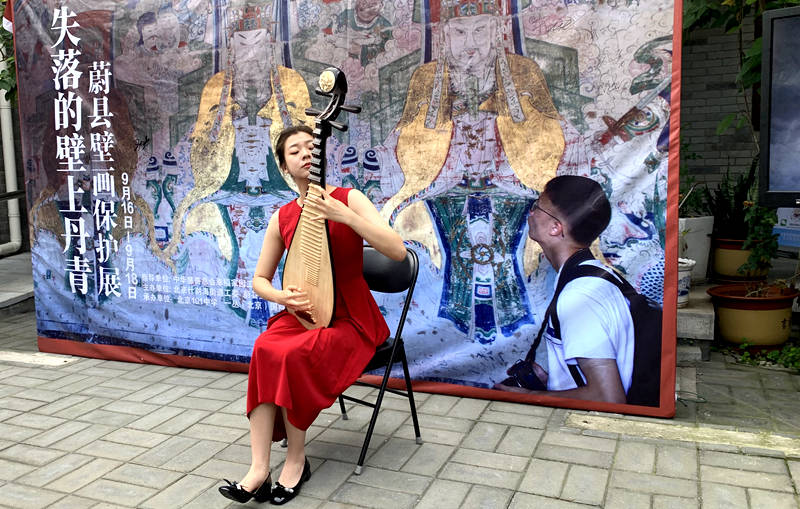 中央音樂學院教授章紅豔特派學生薛元良為現場觀眾彈奏了《遠方的客人請你留下來》《天山之春》琵琶曲。中國傳統民樂與民間壁畫在此交融,相得益彰。