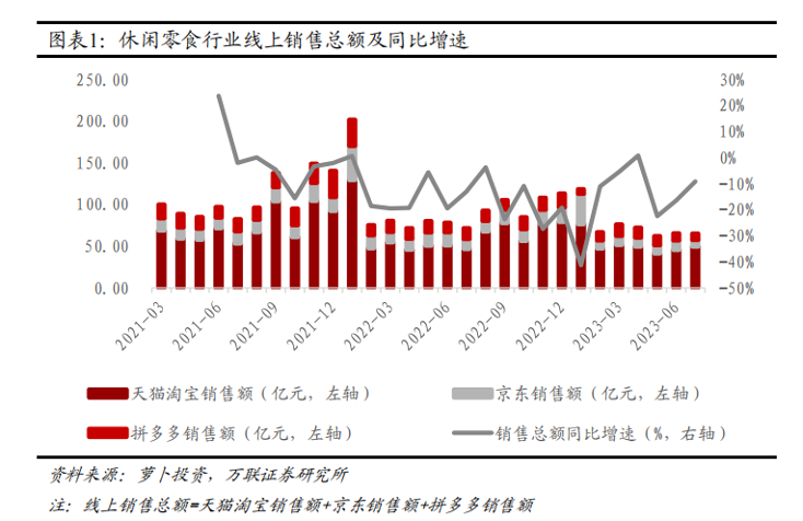另一方面,原本增速極快的電商渠道也出了問題。根據研報數據統計,2022年下半年,休閒零食行業引以為主的電商渠道出現回暖,單月交易總額提升至120-150億元的市場規模,但到了2023年2月以後,電商渠道呈現斷崖式下跌,電商渠道休閒零食月度交易規模已經回落到60-80億的水平。