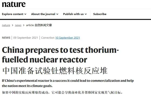 頂級期刊《nature》發表有關中國釷基熔鹽堆的報道
