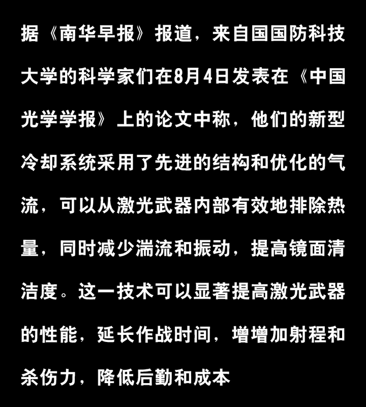 近日《南華早報》援引中國科學雜誌《光學學報》上找到一篇論文,中國的科研團在激光武器內部散熱系統的研製上取得重大突破,我**國已經開發出一種新型冷卻系統,可以讓大功率激光(高能)武器無限使用,而不會產生任何餘熱!**這就意味着高能武器的散熱問題得到徹底解決,解決了中國大功率激光武器(高能武器)實用化問題。有某軍事專家領銜的團隊在文章中表示,這是提高高能激光(高能)武器系統的性能的巨大突破。國防科技大學的專家介紹稱,這種新的冷卻系統,完全的消除了高能激光(高能)武器系統在運行中產生的有害熱量,讓光速的釋放可以無限期保持!只要想要,光束不會出現如何中斷或者性能下降!