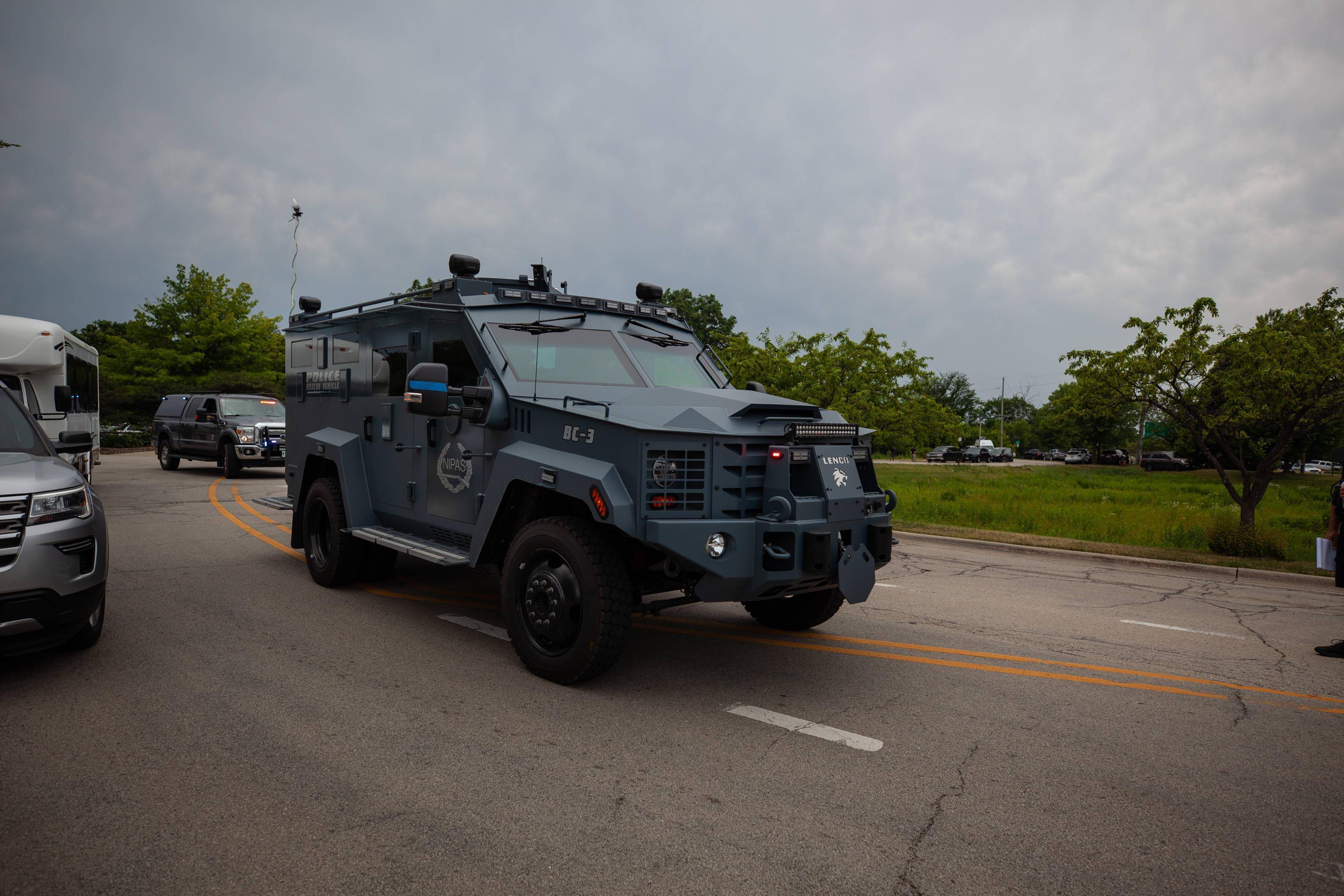 (2022年7月4日,美國中部伊利諾伊州海蘭帕克市舉行“獨立日”遊行時發生槍擊事件,造成至少6人死亡、30人受傷。圖為警車正開往槍擊現場。)