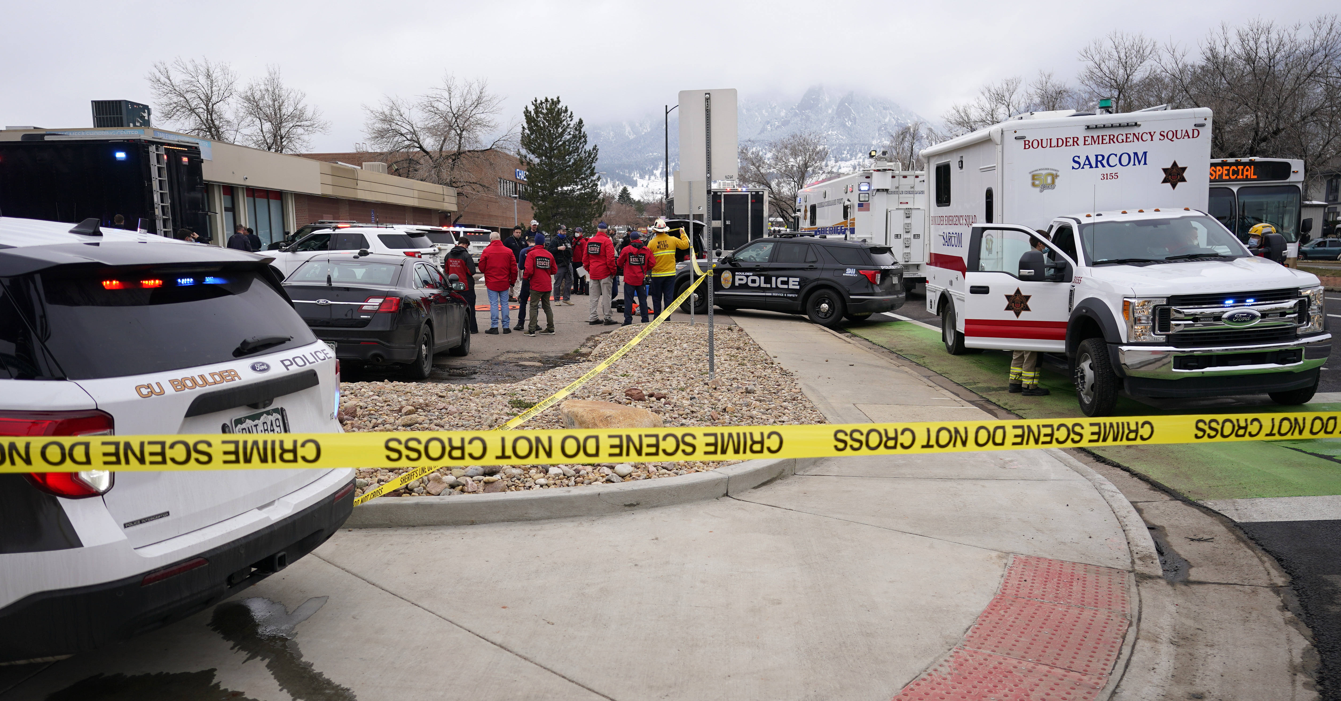(2021年3月22日,美國科羅拉多州博爾德市一家超市發生槍擊事件,造成至少6人死亡。圖為警察和救援人員在的槍擊現場附近工作。)