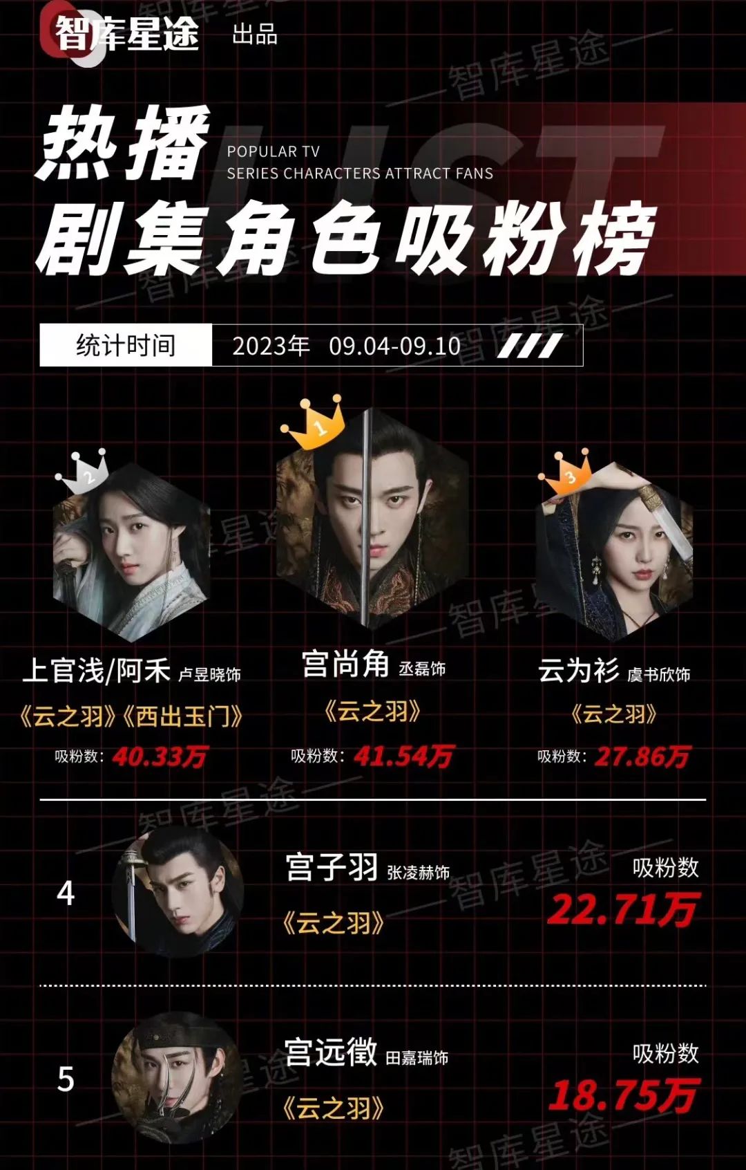 虞書欣粉絲着急維權,可能也是害怕最後“無效播劇”。根據智庫星途上週的統計,《雲之羽》裏最吸粉的是男二丞磊和女二盧昱曉,女主只排到第三位。