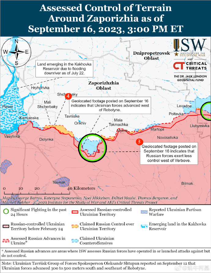 “16日,烏軍隊還向扎波羅熱州西部推進,並繼續突破位於當前推進範圍之前的俄羅斯防禦。16日發佈的地理定位鏡頭顯示,烏軍沿着俄羅斯防禦陣地向羅博季涅以西(庫班以南 10 公里)推進。15日發佈的其他地理定位鏡頭顯示,烏克蘭步兵沿着韋爾博韋以西(庫班東南 18 公里)附近的一系列俄羅斯防禦陣地進一步推進,但很可能沒有保持對這些陣地的控制。烏克蘭步兵在這些俄羅斯防禦陣地的存在表明俄軍也無法控制這些陣地。”