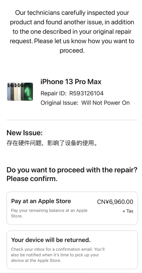 出問題後,蘋果方面回覆説維修要花費4400元,劉金打12315以及蘋果客服反映問題,經過協調,同意只要是硬件的問題,便給予免費維修,然後手機就返廠了。經過了5、6天的等待,劉金收到了蘋果官方發來的郵件,他們説這部手機曾被擅自改裝,需要支付6960元的維修費。