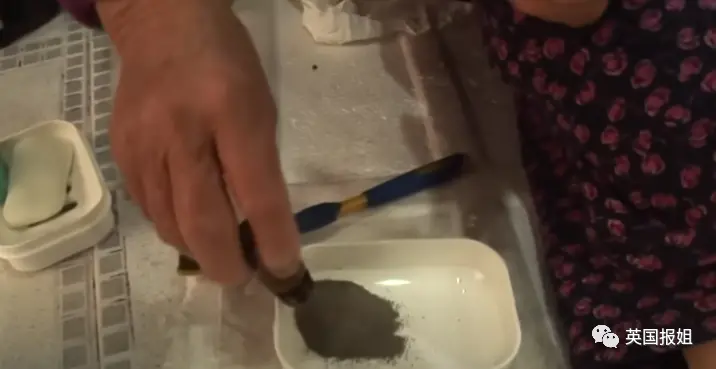 飯後,她又掏出了一些讓記者瞠目結舌的東西,其中包括一小包黑色粉末,她把粉末倒進小盤子裏用水化開,然後用牙刷蘸着這些黑水,一遍一遍地往自己頭上梳。