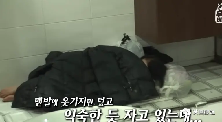 她就躺在衞生間的地上,身下僅僅墊了幾個薄薄的泡沫板,枕頭是裝着東西的塑料袋,身上簡單披了一件大衣。