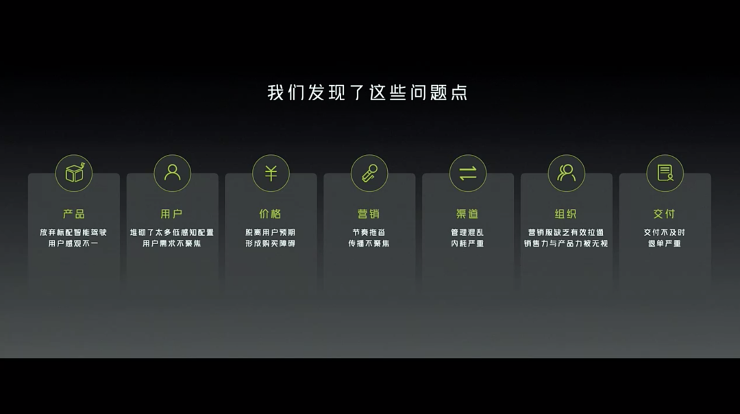 對此,小鵬汽車內部也進行了深刻的反思。在發佈會現場,何小鵬總結出產品、用户、價格、營銷、渠道、組織、交付等六大問題。