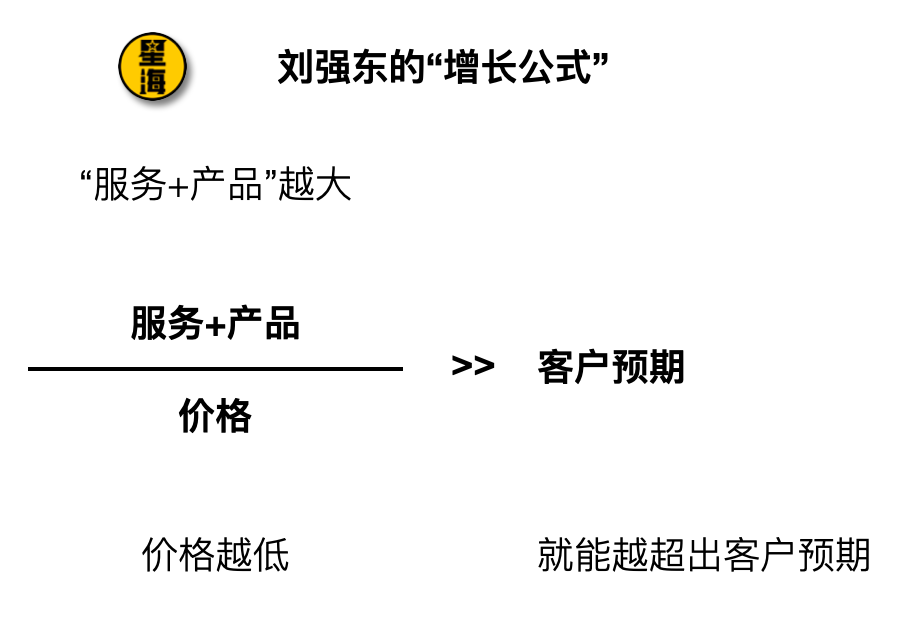 劉強東有一個關於增長的公式,他認為產品、服務、價格綜合起來,遠遠大於客户預期,才能實現增長。這個公式今天適用,而且在可預期的未來裏,也將長久地適用下去。