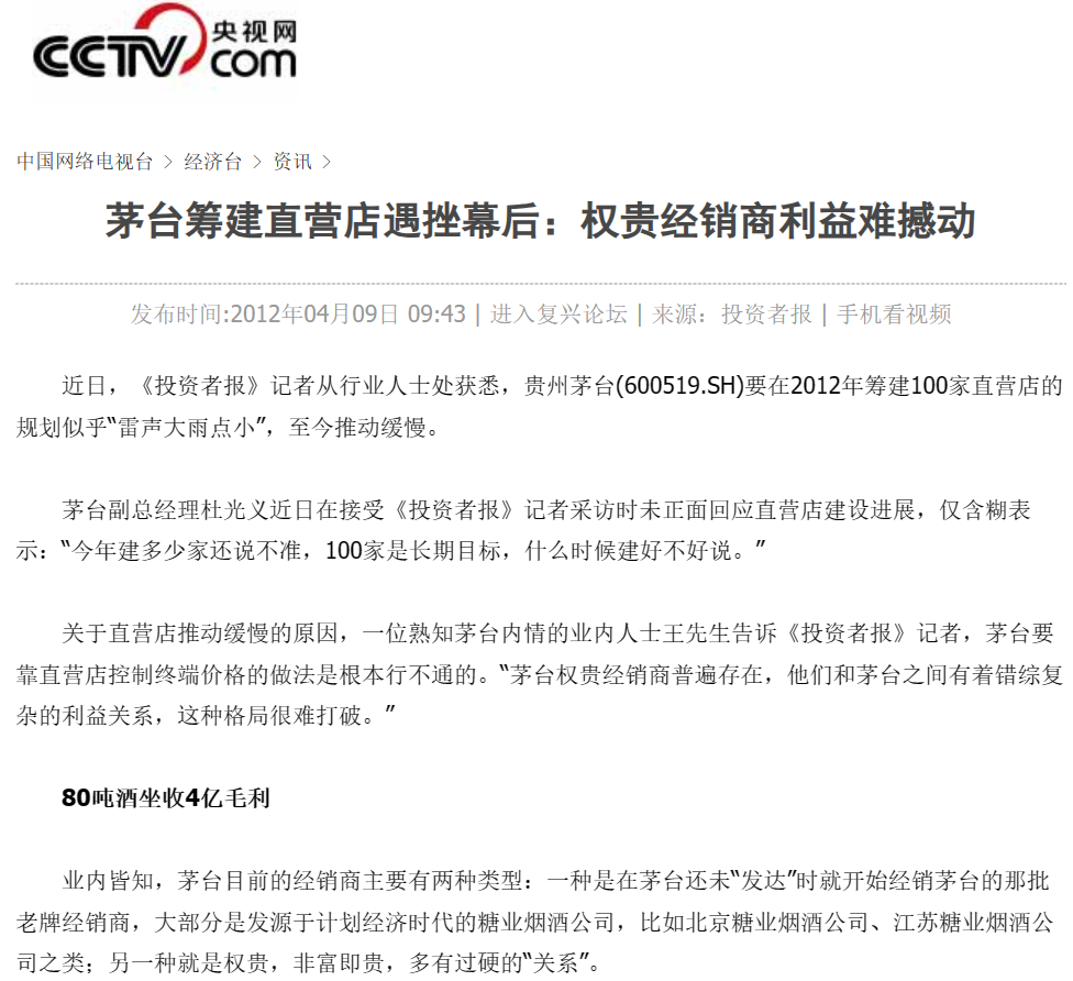 2012年,茅台就想一年籌建110家直營店,籌建搞了幾個月,底氣是越來越不足。到了後期,對外口徑就變了: