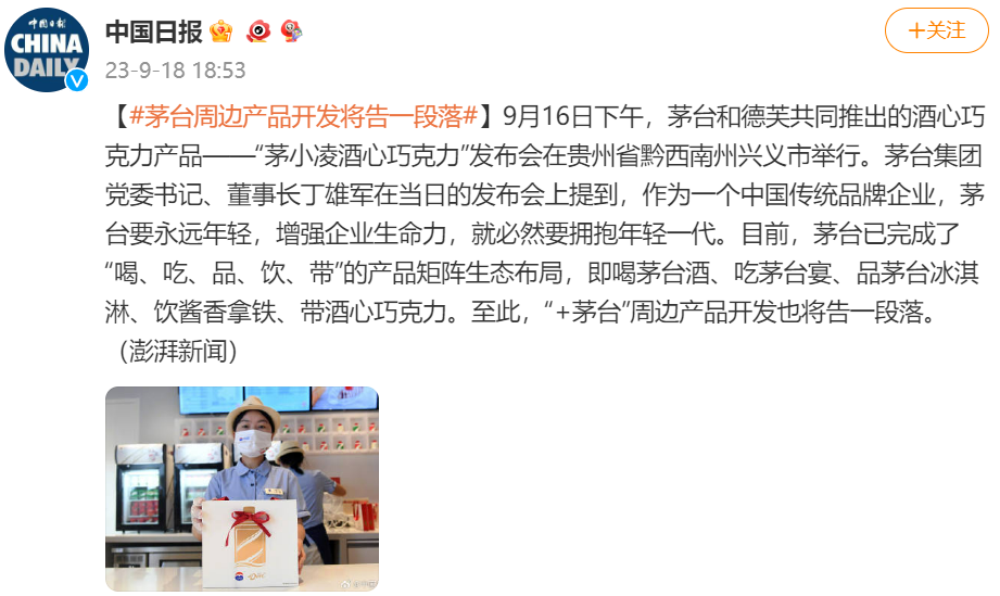 前兩天,茅台聯名德芙推出了“茅小凌酒心巧克力”,據説一上架就被秒光了。