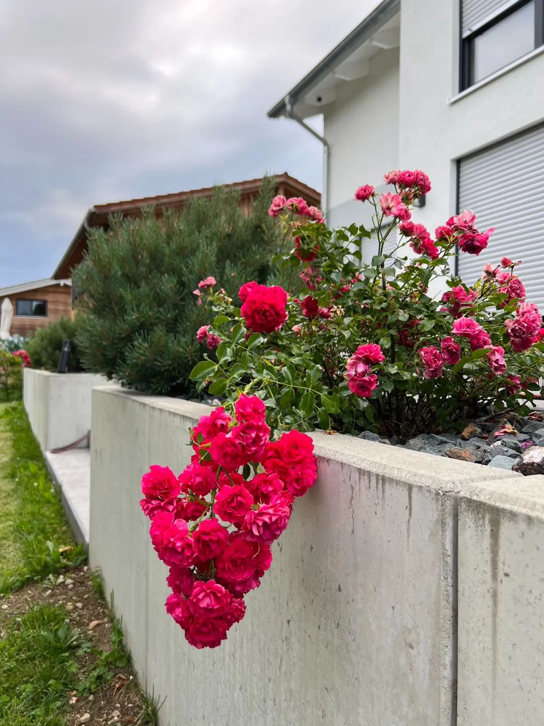 還沒進入家門,先看到了花園的樣子,樹木鬱鬱葱葱,長高了很多,玫瑰開得熱烈,大捧的花朵順着露台邊緣傾瀉而下,草坪也很規整,完全看不出這房子兩年無人居住的樣子。