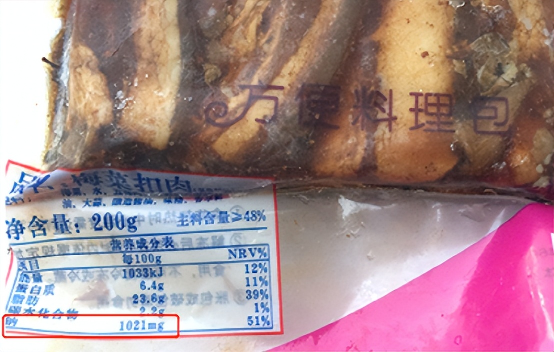 再比如下圖這款梅菜扣肉的料理包,一包主料含量約為96克。鈉含量高達1021毫克/100克,一包約摺合鹽2.5克,佔到了推薦量的50%,也是不低了。