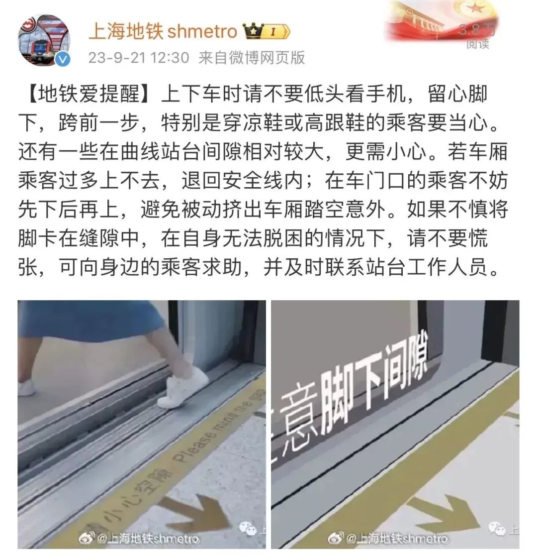 9月19日,@上海地鐵shmetro再次發博提醒乘客小心站台間隙。