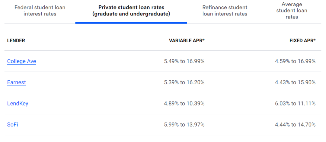 私人金融機構提供的學貸利率如圖,聯邦研究生學貸利率也有6.5%-7.5%